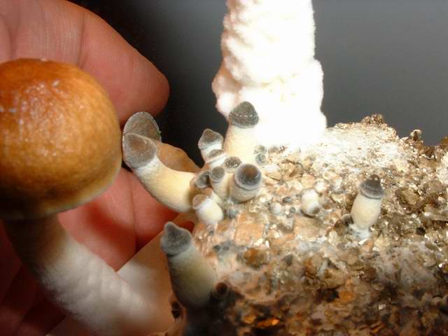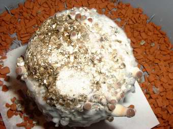 En 5-10 días (con algunas especies puede tardar hasta 30 días) se empezarán a ver pequeñas acumulaciones de micelio llamados primordios. Éstos son el comienzo de las setas. En un par de días, se podrán ver perfectamente pequeñas setas con sombrero marrón creciendo dentro del vaso. Es el momento de "parir" el pastel (sacarlo del vaso) y ponerlo en el terrario donde se desarrollarán completamente. Algunas especies no producen setas tan fácilmente. Si es el caso, mete los vasos en bolsas de plástico y ponlos en la nevera (no congelador) durante toda la noche. Al día siguiente, saca los pasteles del vaso y mételos en el terrario para que fructifiquen. Éste shock de frío (cold shock) provoca que el micelio empiece a producir setas.