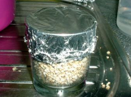 Atraviesa con la aguja el papel de aluminio en un punto cercano al borde del vaso (ver foto). Introduce la aguja unos 2-3 cm. e inyecta las esporas mientras la aguja toca con el borde interior del vaso, podrás ver como parte de la solución escurre hacia el fondo del vaso. Cada vaso se inoculará en cuatro puntos diferentes y equidistantes, viene explicado en uno de los puntos anteriores. Hay que inyectar entre 1-1.5 cc de solución de esporas en cada vaso (0.25-0,4 cc por agujero). Por tanto, con una jeringuilla de 10 cc podremos inocular entre 6-10 vasos.
