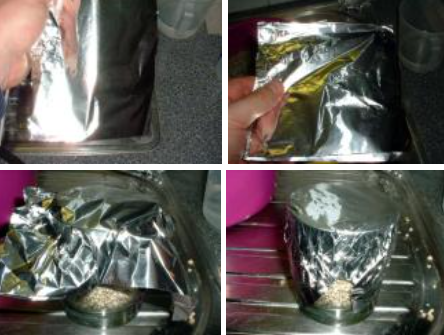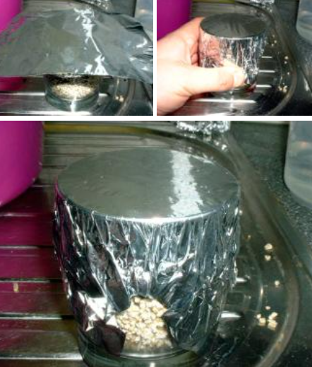 Pon sobre el vaso ya cubierto otro trozo de papel de aluminio de unos 12 cm x 12 cm. Si has preparado tarros, cubre la tapa igualmente. Dejaremos los bordes del papel de aluminio un poco separados del vaso ya que ésta última capa habrá que quitarla para inocular las esporas en el sustrato. El resultado final es un vaso cubierto por 3 capas de papel de aluminio.