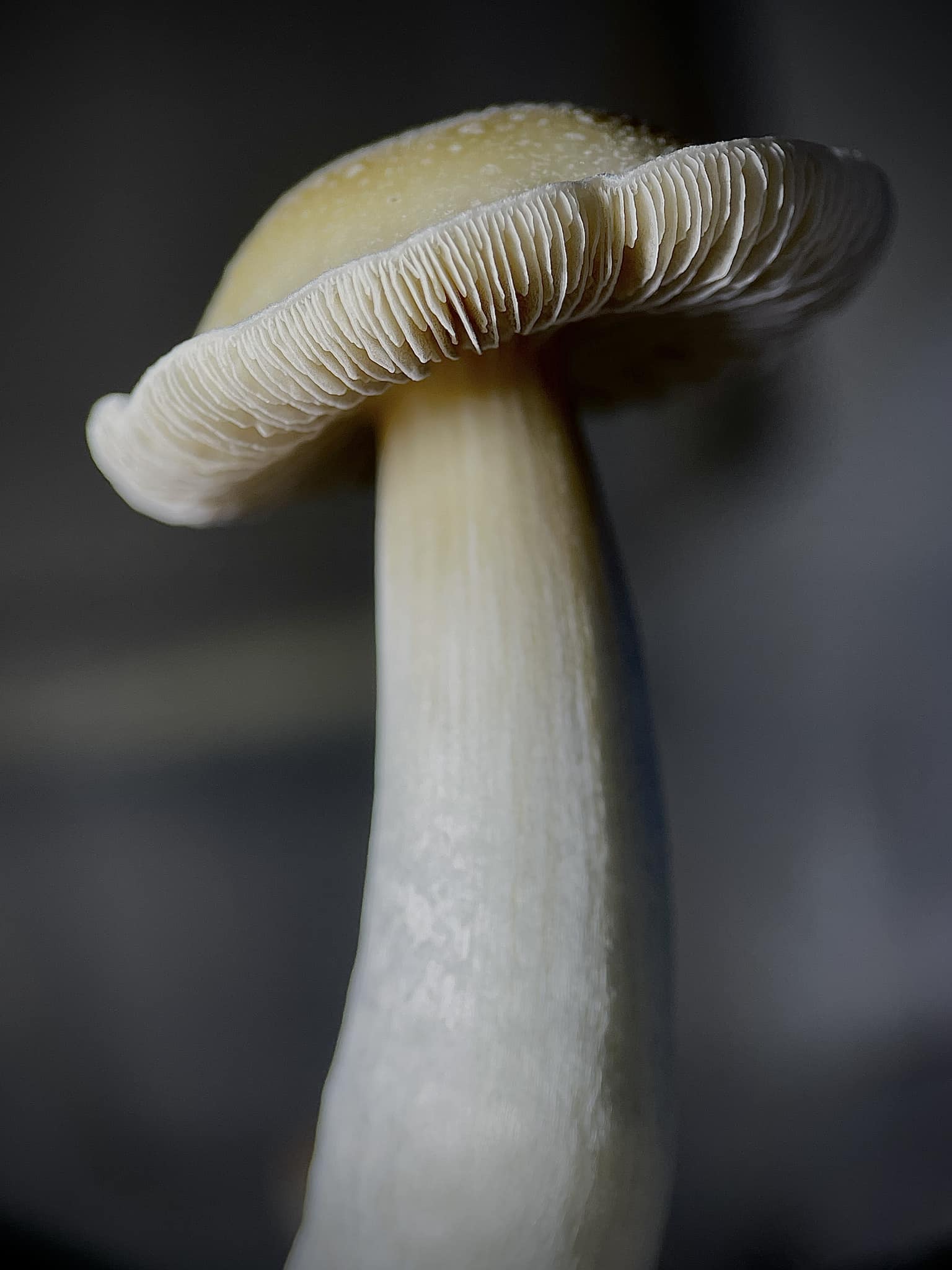 Branquias: Inicialmente cubiertas por un velo, luego grises con bordes blancos, volviéndose de color negro púrpura a medida que maduran las esporas.